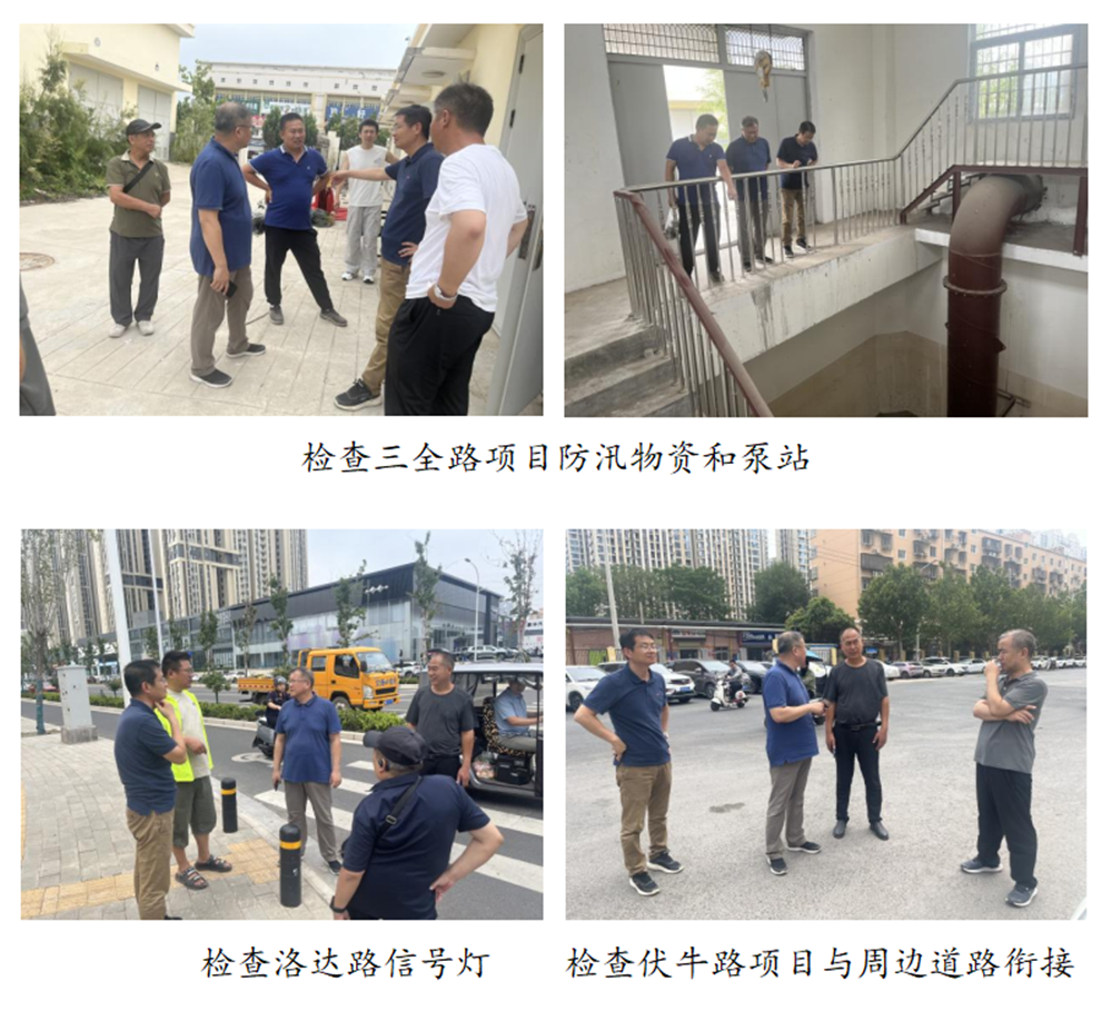 黄志澎分别检查了魏河北路项目的排水、丽水路项目的桥梁架设和道路施工、洛达路项目和荷花街项目与周边道路的安全衔接、三全路项目的河道铺砌和下穿铁路涵洞泵站,并查看了防汛物资准备情况。